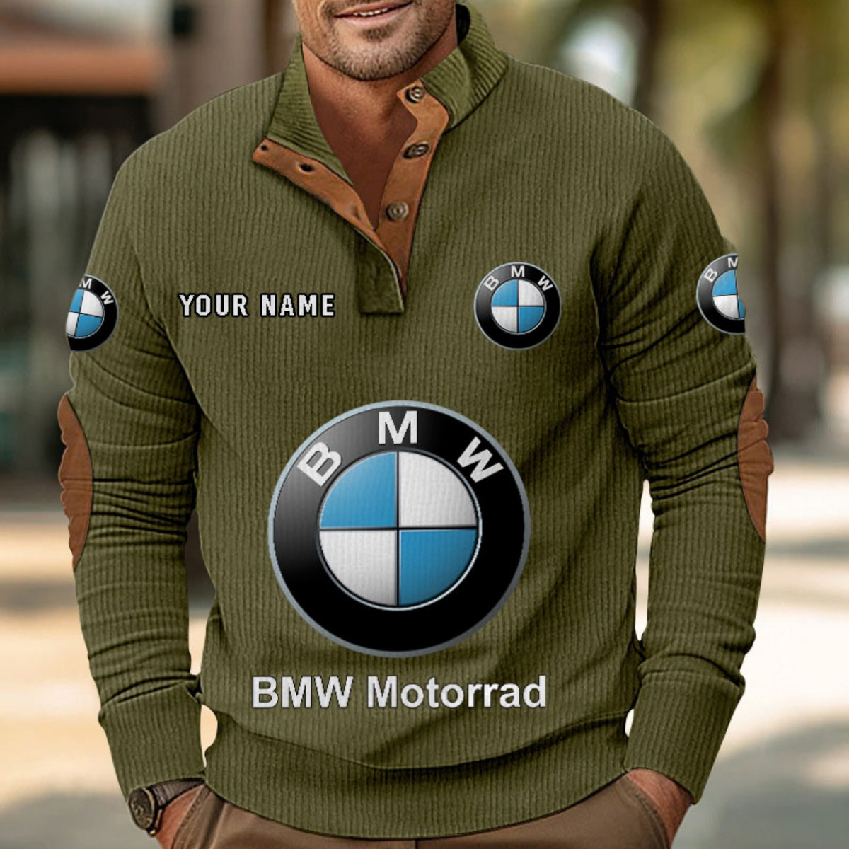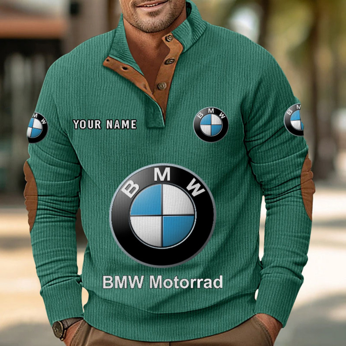 Doté d’un col montant, d’une patte de boutonnage partielle et de détails raffinés comme des empiècements en suédine au col et aux coudes,