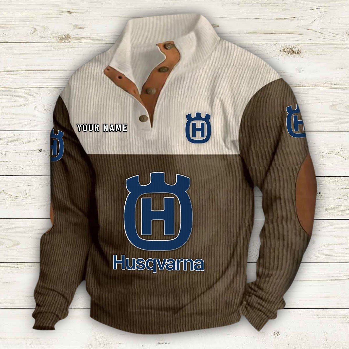 Col montant avec patte de boutonnage, empiècements en suédine au col et aux coudes, poche kangourou et boutons métalliques de qualité.