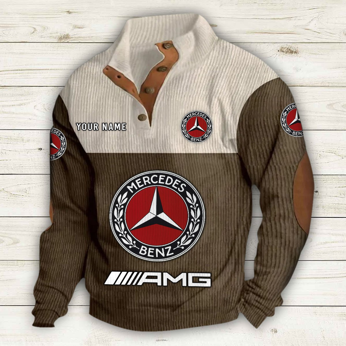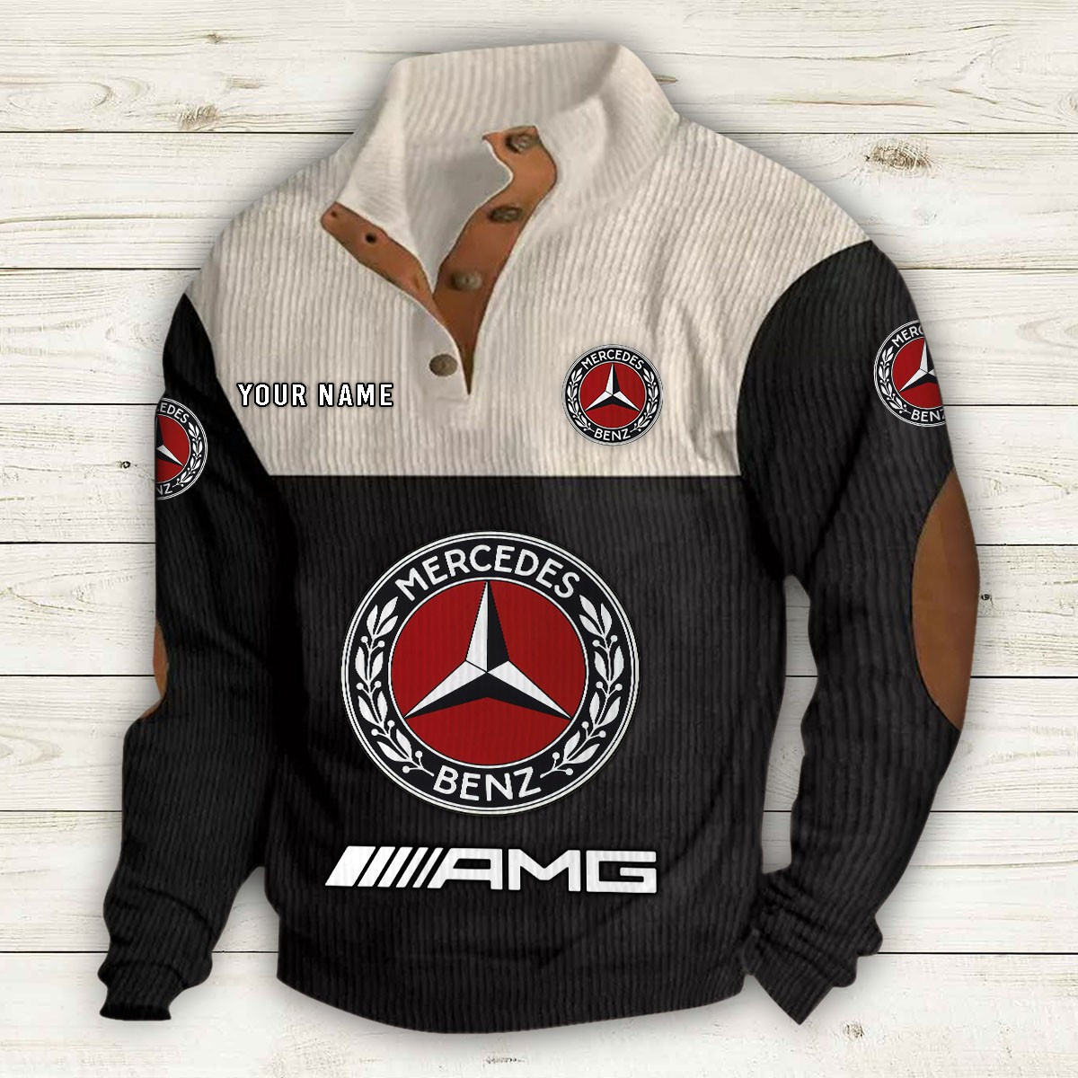 Doté d’un col montant, d’une patte de boutonnage partielle et de détails raffinés comme des empiècements en suédine au col et aux coudes,