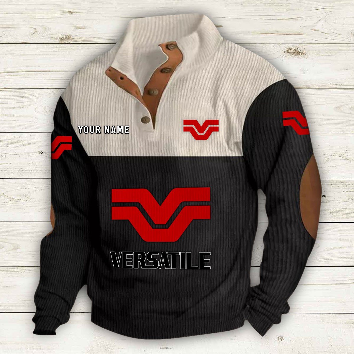 Col montant avec patte de boutonnage, empiècements en suédine au col et aux coudes, poche kangourou et boutons métalliques de qualité.
